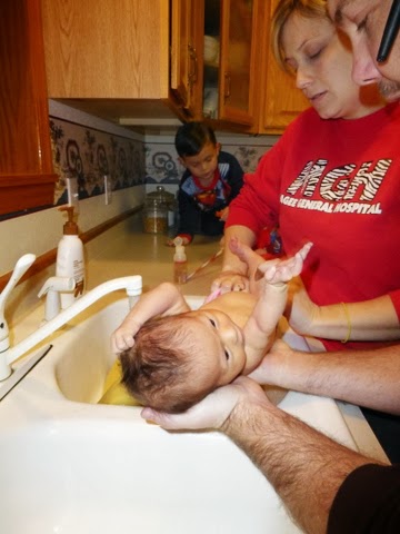 Clara's first bath was a family affair. With all of our children, Sam and I have our "roles" at bath time, and they haven't changed. He does the holding, and I do the scrubbing. Good teamwork right there! And the boys were pretty interested in what we were doing. However, halfway through the bath they decided that their game of superheroes was more fun and ran off to catch bad guys. Clara enjoys her baths and LOVES for her hair to be washed and brushed. She does not, however, like to be cold one little bit and will quickly let you know about it!
